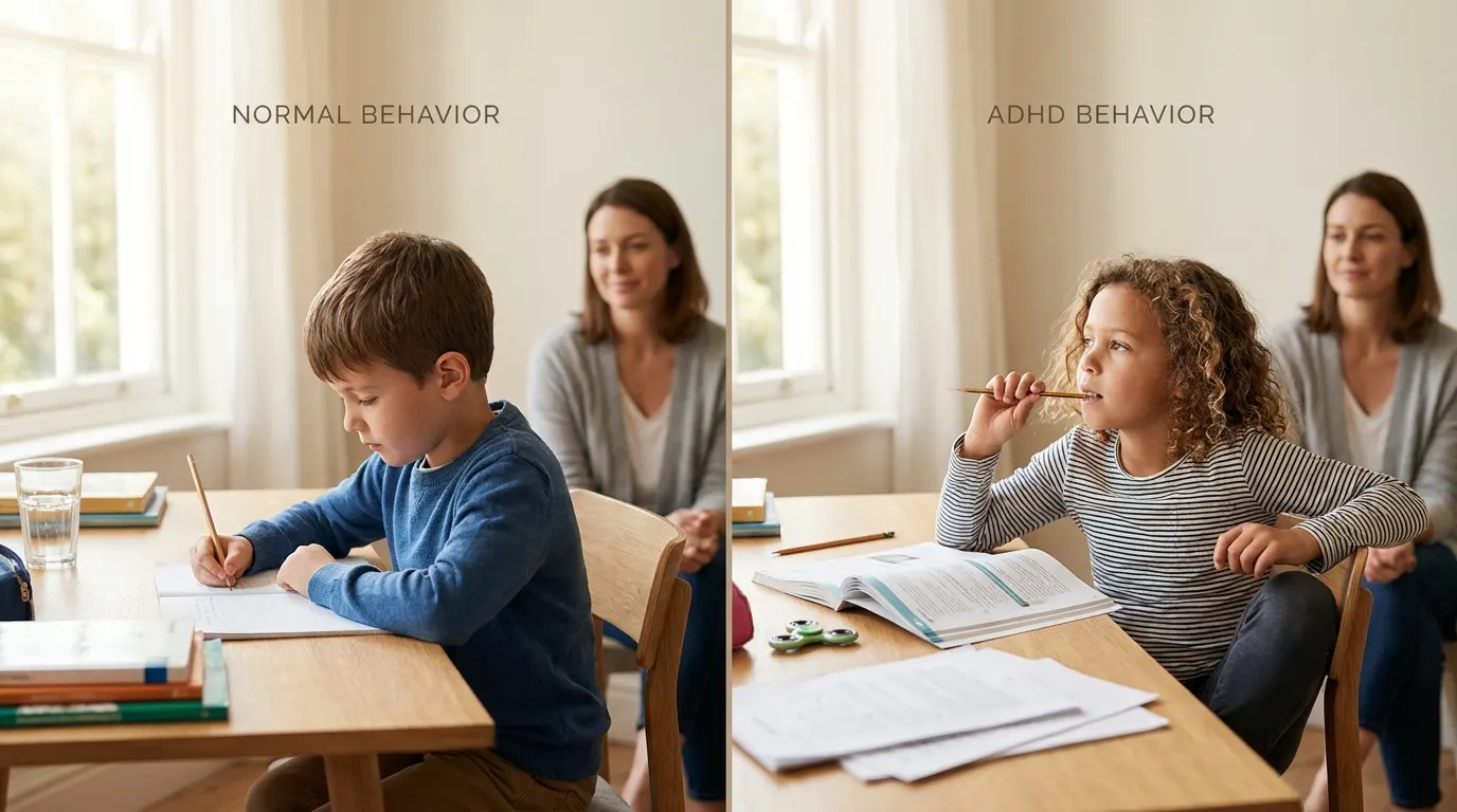 ADHD in children guide showing normal behavior vs ADHD behavior comparison in study setting