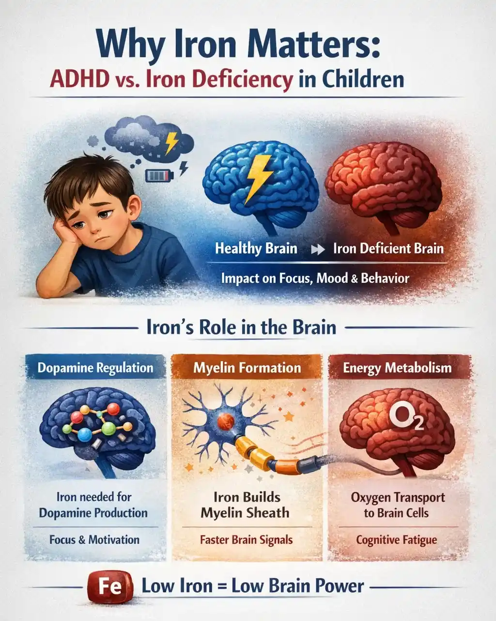 • The Biological Link: Iron is essential for dopamine activity. Low levels can mimic ADHD-like traits by affecting brain energy metabolism.