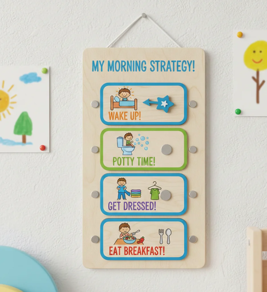 • The Strategy: Create a vertical board with simple icons or photos of your child performing each task (waking up, potty, dressing, eating).