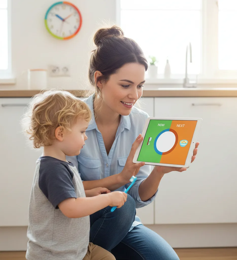 • Pro Tip: Use a visual timer or a simple cue (like a sticker chart or colored card) so your child can see each step coming. This helps their brain anticipate the transition and reduces resistance.