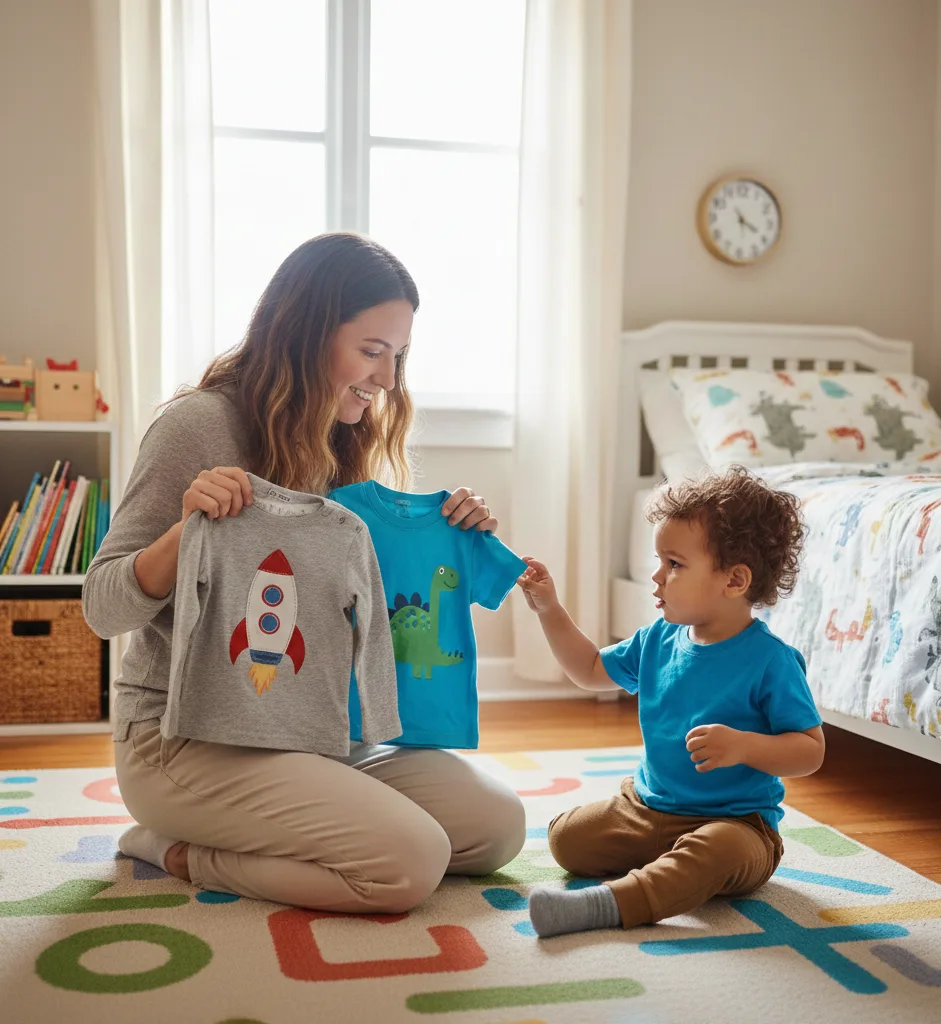 8:10 AMThe "Two-Choice" DressGive two specific options (Dino vs Robot shirt) to avoid paralysis.